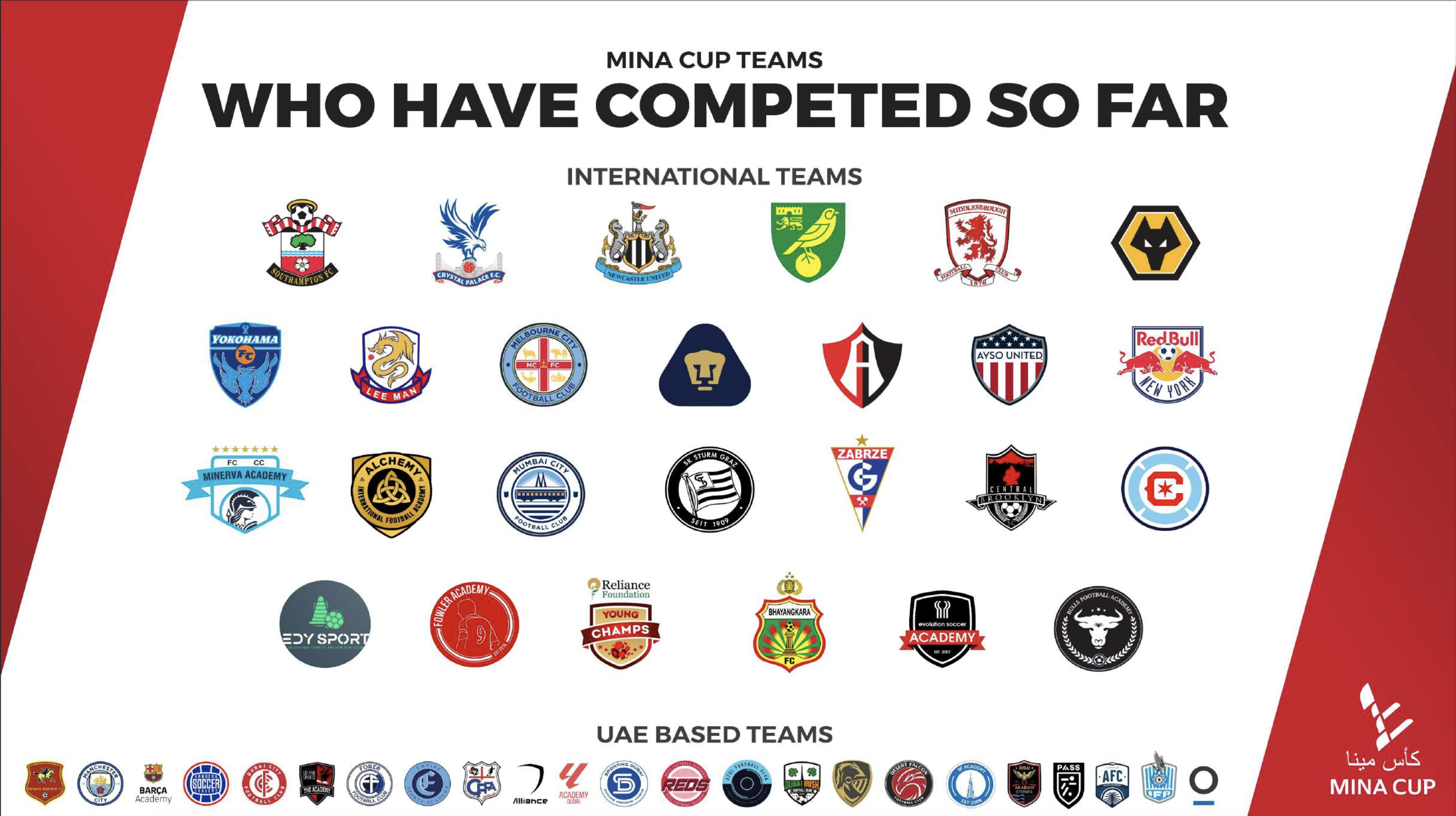 Since its inception, the Mina Cup has grown rapidly, with its most recent edition in 2024 welcoming 40 teams from around the world, spanning five continents. The tournament showcases elite football academies and clubs such as: